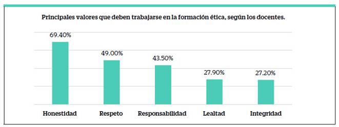 Otro hallazgo del estudio es que desde la perspectiva de los docentes hay un reconocimiento importante a que los valores de igualdad y respeto, se integren a la matriz de valores significativos de la EAN. En ese mismo sentido, se reitera dentro de la formación ética de los futuros profesionales en el ámbito de la Administración de Negocios, los cinco valores a trabajarse: honestidad, respeto, responsabilidad, lealtad e integridad. Por lo tanto, se muestra que ninguno de los valores de mayor presencia en la respuesta de los docentes, están acordes con los valores humanistas, ni empresariales que la EAN tiene definidos en sus documentos oficiales, por lo que la investigación aporta a una revisión y actualización del abordaje pedagógico de los valores de esta Escuela.