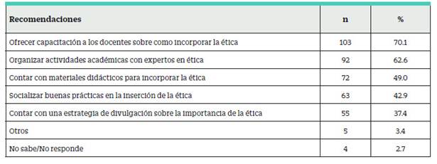 Finalmente, en la Tabla 1 se muestran las recomendaciones que los docentes ofrecen para favorecer la ética dentro de la formación profesional en la Administración de Negocios. Finalmente, los docentes consultados destacan la importancia de este tipo de proyectos de investigación orientados al tema de la ética y señalan,