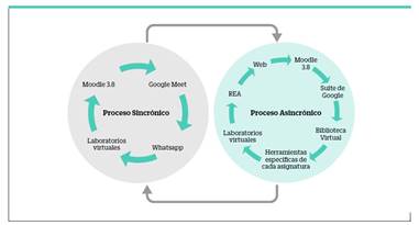 En este ecosistema virtual el proceso educativo se desarrolla articulando el proceso sincrónico dirigido por el docente con espacios asincrónicos coordinados por el docente o generados por los propios estudiantes como parte de sus necesidades de aprendizaje. En este modelo no solo las actividades del proceso sincrónico condicionan a las del asincrónico, sino que la información generada en condiciones de asincronía condiciona el desarrollo mismo de la asignatura y los diferentes componentes didácticos de las actividades docentes organizadas de modo sincrónico.