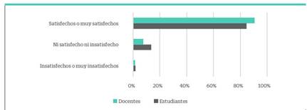 Estos instrumentos revelan que después de las primeras tres semanas de trabajo más del 80% de los docentes y estudiantes se encuentran satisfechos o muy satisfechos con el desarrollo de la docencia presencial con mediación virtual, mientras que solo un rango inferior al 3% declaran sentirse insatisfechos o muy insatisfechos (ver Figura 3).