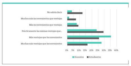 Una diferencia igualmente significativa aparece al responder si una vez que terminen las condiciones de confinamiento les gustaría continuar recibiendo o impartiendo las clases a través de esta modalidad. El 60% de los docentes y el 45.7% de los estudiantes encuestados son favorables a continuar con la modalidad presencial con mediación virtual, frente a un 19.2% y un 37.2% que no quisieran continuar con esta modalidad. Declaran que aún no pueden decidir si les gustaría o no continuar con esta modalidad el 20.8% de los docentes y el 17% de los estudiantes.