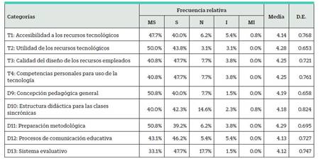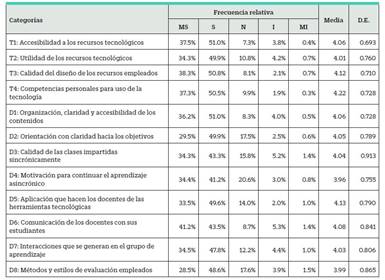 Al analizar por categorías los grados de satisfacción de los estudiantes, se evidencia que la mayor satisfacción es con T4, mientras que las categorías con las que expresan menor satisfacción son D4 y D8 (Ver Tabla 2).