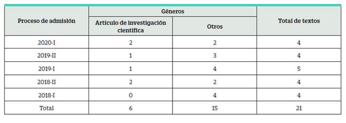 Si bien los géneros condensados en la categoría "otros" de la Tabla I corresponden a fuentes diversas, tales como periódicos nacionales (El Comercio, La República) e internacionales (El País), blogs, boletines informativos (National Geographic) y manuales escolares (tomados a partir del proceso 2019-I, debido a la introducción de textos en inglés), se resalta la relación directa de su contenido con las diferentes especialidades agrupadas en cada área.