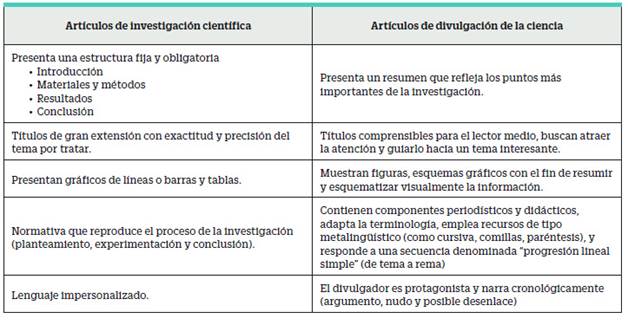 Llácer y Ballesteros (2012) detallan las diferencias entre el lenguaje de artículos de investigación científica y el lenguaje de la divulgación de la ciencia, diferencia que puede ser utilizada como referente estructural de ambos discursos y como camino para lograr uno basado en el otro. (ver Tabla 3).