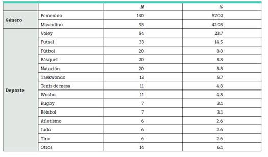 La muestra de este estudio instrumental (Alarcón, 2008) estuvo compuesta por un total de 228 deportistas provenientes de 22 universidades de Lima Metropolitana de 2do a 12do ciclo (M = 6.87; DE = 2.62), cuyas edades oscilaron entre los 17 y 29 años (M = 21.24; DE = 2.39). Además, tenían alrededor de 18 meses entrenando con sus entrenadores (M = 17.79 meses; DE = 14.70), y entrenaban en promedio alrededor de cuatro veces por semana (M = 3.63; DE = 1.23), y por un promedio de 2.26 horas por entrenamiento (DE = 0.59). La distribución de la muestra, de acuerdo a las variables sociodemográficas género y deporte que practica, se puede observar en la Tabla 1.