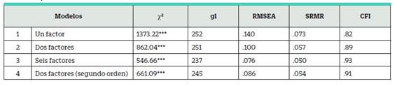 Los resultados de los AFC fueron evaluados a través de los índices de ajuste recomendados por Hu & Bentler (1999): chi-cuadrado (χ2), raíz cuadrada media del error de aproximación (RMSEA, Root Mean Square Error of Approximation), la raíz cuadrada media residual estandarizada (SRMR, Standardized Root Mean Square Residual), y el índice de ajuste comparativo (CFI, Comparative Fit Index). Así, se compararon los chi-cuadrado (χ2) de los diferentes modelos, siendo el mejor modelo el de menor valor (Kline, 2016); el RMSEA y el SRMR, donde valores de RMSEA que indican buen ajuste del modelo son valores cercanos a .07 y aceptable si es menor o igual a .08, mientras que un SRMR menor a .08 indica un excelente ajuste (Marsh, Hau & Wen, 2004; Simms, Watson & Doebbeling, 2002; Steiger, 2007). El CFI indica un ajuste óptimo cuando obtiene un valor mayor o igual a .95, y aceptable cuando está alrededor de .90 (Hu & Bentler, 1999; Kline, 2016).