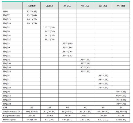 Todas las cargas factoriales estuvieron por encima del .40 y obtuvieron comunalidades entre .21 y .79 (ver Tabla 3). Con respecto a la confiabilidad del IBQD, el coeficiente omega de McDonald para los seis factores alcanzó un rango entre .81 y .90. El rango de correlaciones ítem-test estuvo entre .51 y .82 (ver Tabla 3). Adicionalmente, se presenta también la Varianza Media Extraída (AVE; Average Variance Extracted), donde valores cercanos o superiores a .50 muestran buena validez convegente interna (Raykov, 1997).