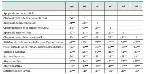 Por su parte, las correlaciones que se llevaron a cabo para comprobar las evidencias de validez convergente y discriminante resultaron ser significativas (ver Tabla 4). Así, se encontró que los tres factores de apoyo (i.e. AA, AC y AR) correlacionaron de manera positiva (entre .18 y .73) con la satisfacción de las NPB, la vitalidad subjetiva, el afecto positivo y la satisfacción con la vida, y obtuvieron correlaciones negativas (de -.25 a -.56) con la frustración de las NPB, el burnout deportivo y el afecto negativo. Mientras que los tres factores de obstaculización (i.e. OA, OC y OR) correlacionaron positivamente (entre .32 y .68) con la frustración de las NPB, el burnout deportivo y el afecto negativo, y negativamente (de -.15 a -.68) con la satisfacción de las NPB, la vitalidad subjetiva, el afecto positivo y la satisfacción con la vida.