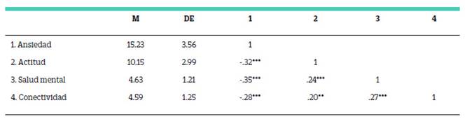 Todas las correlaciones bivariantes entre Ansiedad al Aprendizaje en Línea, Actitud hacia las Clases en Línea, Salud Mental Autopercibida y Calidad de la Conectividad fueron estadísticamente significativas, aunque con tamaños de efecto relativamente bajos.