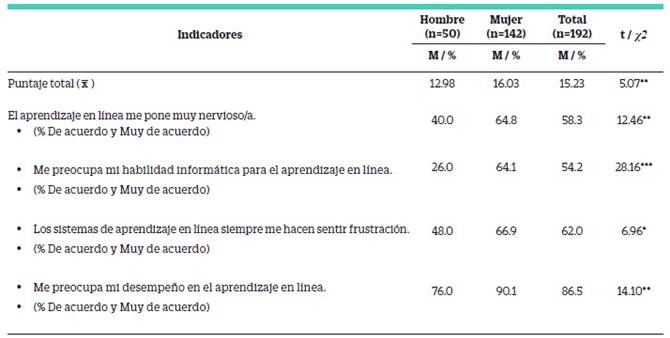 De acuerdo con los datos de la Tabla 2 se aprecia que hay diferencias significativas en las proporciones de los indicadores de nerviosismo [x2(2, n=192)=12.46, p<.01, V=.26], preocupación por la habilidad informática [x2(2, n=192)=28.16, p<.001, V=.38], frustración [x2(2, n=192)=6.96, p=.03, V=.19] y preocupación por el desempeño [x2(2, n=192)=14.10, p<.01, V=.27]. Mientras que un 40% de los hombres manifestó sentirse nervioso por el aprendizaje en línea, en las mujeres esta cifra ascendió a un 64.8%, valor que representa una diferencia de 25 puntos porcentuales. En el indicador de preocupación por la habilidad informática se alcanza la diferencia más ostensible entre hombres y mujeres, toda vez que estas últimas (64.1%) duplican a los hombres (26.0%) en el porcentaje que considera estar de acuerdo o muy de acuerdo con la afirmación del ítem. En cuanto al indicador de frustración, aunque con diferencias poco significativas, también son las mujeres quienes presentan un porcentaje mayor (66.9%) y estadísticamente diferente al de los hombres (48.0%). Finalmente, en el indicador de preocupación por el desempeño se observa que un 90.1% de las mujeres señaló estar de acuerdo o en desacuerdo con la afirmación del ítem, alcanzando una diferencia de 14 puntos porcentuales sobre el grupo de hombres.