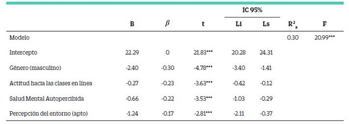 El análisis final incluyó un modelo de regresión lineal múltiple considerando a la Ansiedad al Aprendizaje en Línea como la variable predicha y al Género, la Actitud hacia las Clases en Línea, la Salud Mental Autopercibida y las Condiciones del Entorno como predictores. Las variables Género y Condiciones del Entorno fueron codificadas en formato binario para su aplicabilidad como variables dummy. Las variables fueron ingresadas a la ecuación a través del método Stepwise. Se procuró satisfacer los supuestos de linealidad, homocedasticidad y no multicolinealidad. Todos los análisis se realizaron desde el programa SPSS versión 21.0.