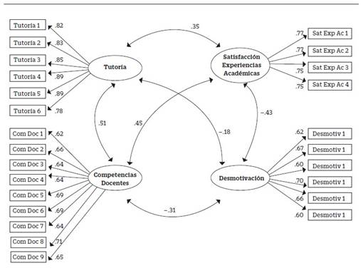 Se apreció que entre tres de los cuatro constructos abordados (Tutoría, Satisfacción de Expectativas Académicas y Competencias Docentes) hubo covarianzas positivas y significativas directamente proporcionales una respecto de la otra, mostraron que varían en la misma dirección. Por otro lado, el factor de Desmotivación se apreció que este covarió de manera negativa con los tres constructos restantes, lo cual sugiere cuando una variable crece la otra variable decrece. De acuerdo con los resultados, ante mayor incremento de Tutoría, Satisfacción de Expectativas Académicas y Competencias Docentes, será mayor el decrecimiento de Desmotivación, lo cual se encuentra respaldado por la literatura especializada.