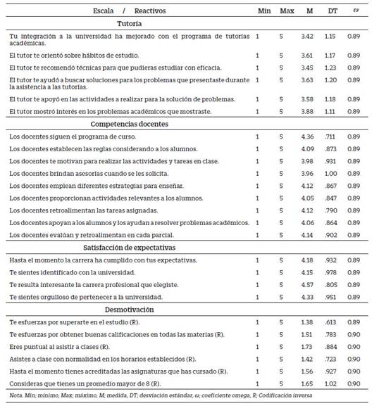 Los descriptivos en tutorías demuestran que los estudiantes están ni de acuerdo ni en desacuerdo en los apoyos y acompañamiento de los docentes en lo que concierne al programa de tutorías, sin embargo, con relación a las competencias docentes manifestaron que casi siempre muestran actitudes de interacción positiva hacia los estudiantes, motivan y emplean estrategias relevantes para ellos. En cuanto a la satisfacción de expectativas se encontró que definitivamente sí han cumplido con lo deseado y hay sentido de pertenencia hacia su universidad y sobre la desmotivación no se encontraron indicadores negativos en su desempeño académico en la obtención de calificaciones aprobatorias, así como el esfuerzo por la asistencia y puntualidad. Los cuatro factores analizados presentaron alta fiabilidad, lo que demuestra la confianza en los resultados de la escala.