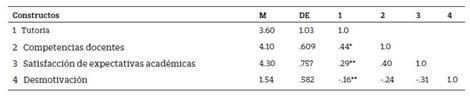 Resultados: : Indican que la tutoría, satisfacción de expectativas académicas y competencias docentes tuvieron covarianzas positivas y significativas. Con respecto a la desmotivación, esta covarió de manera negativa con los tres constructos restantes, lo que sugiere validez divergente entre el resto de los constructos.