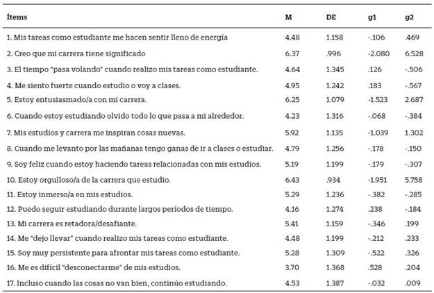 Las estimaciones realizadas en esta sección se efectuaron con la muestra de estudiantes de primer año (n=333), a quienes se les aplicó el instrumento completo de 17 ítems. En primer lugar, se realizó un análisis descriptivo de los ítems, donde las medias más altas se encontraron en los ítems "Estoy orgulloso/a de la carrera que estudio." (M=6.43; DS=.934), "Creo que mi carrera tiene significado" (M=6.37; DS=.996 y "Estoy entusiasmado/a con mi carrera" (M=6.25; DS=1.079), todos ellos pertenecientes al factor Dedicación. Por su parte, la media más baja se observa en el ítem "Me es difícil "desconectarme" de mis estudios" (M=3.70; DS=1.368) correspondiente al factor Absorción. Con respecto a los valores de asimetría y curtosis, la mayoría de los reactivos del instrumento presentaron valores absolutos inferiores a 1, con la excepción de los ítems 2, 5, 7, y 10.