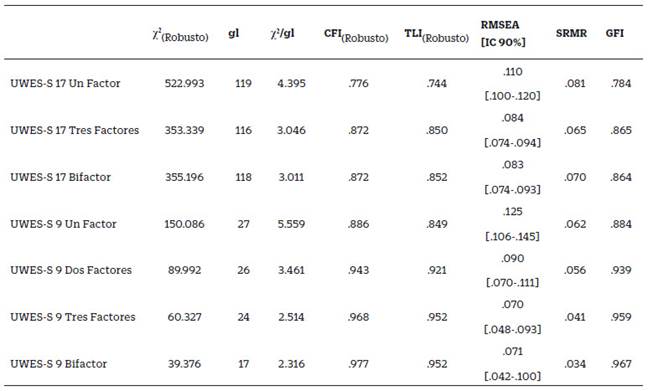 Resultados: al comparar siete modelos estructurales, los mejores indicadores de ajuste fueron encontrados en el UWES 9S de acuerdo con un modelo de tres factores y a un modelo bifactor (X2/df=2.316; CFI=.977; TLI=.952; RMSEA=.071). El UWES 9S mostró indicadores de confiabilidad ω de McDonald entre .67 y .83 en sus tres factores, demostrándose también la invarianza de su estructura de tres factores según sexo y en distintos niveles de estudio.