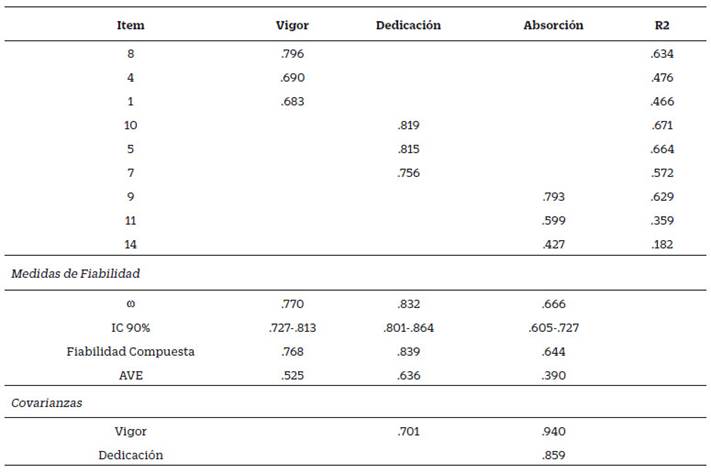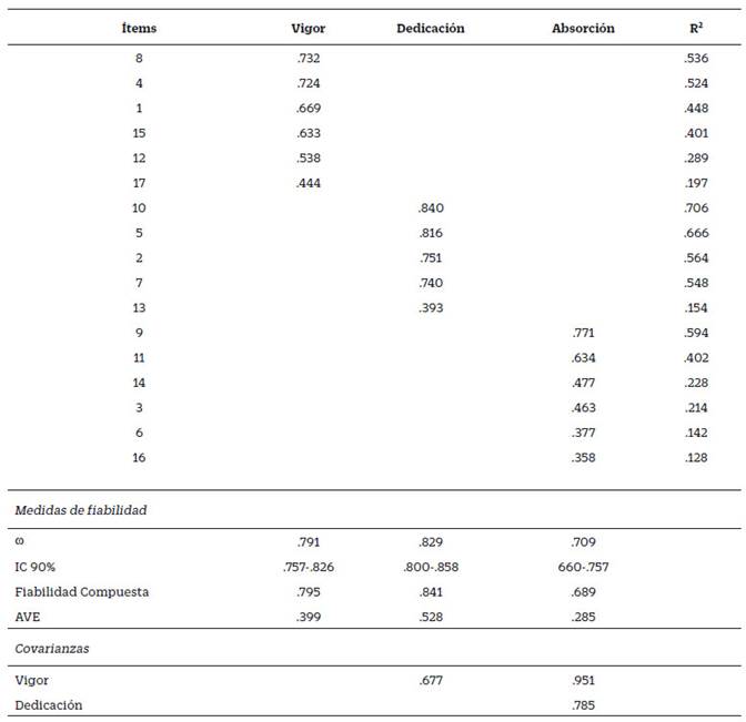 La Tabla 4 muestra las cargas factoriales, covarianza, varianza extraída media y confiabilidad de la versión corta del instrumento de acuerdo con su estructura de tres factores. Al igual que la versión de 17 ítems, se observa una alta relación entre los factores, con covarianzas que se encuentran entre .701 y .940. En este caso, a diferencia de la versión de 17 ítems, se aprecia un valor bajo de la varianza extraída media solo en la dimensión absorción (AVE=.390). Con relación a la confiabilidad, los factores Vigor (ω de McDonald=.770) y Dedicación (ω de McDonald=.832) muestran valores adecuados superiores a .700; sin embargo, la dimensión Absorción (ω de McDonald=.666) muestra un valor levemente inferior a ese parámetro. Esto es consistente con lo apreciado en los valores de fiabilidad compuesta.