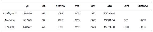 En cuanto a la verificación de la invarianza factorial según sexo (ver tabla 5), en primer lugar, se analizó la invarianza configural del UWES 9S, mostrando valores aceptables (CFI=.972; TLI=.958; RMSEA=.097). Los resultados evidencian que el modelo de tres factores se ajusta a los datos en ambos grupos. En segundo lugar, se evaluó la invarianza métrica apreciándose valores favorables (CFI=.972; TLI=.963; RMSEA=.090). Al comparar los resultados de la invarianza métrica y configural no se observan cambios significativos (ΔCFI= .001 y ΔRMSEA = -.007). Los hallazgos sugieren que las cargas factoriales son invariantes entre ambos grupos. En tercer lugar se evaluó la invarianza escalar. Los resultados muestran adecuados índices de ajuste (CFI=.973; TLI=.967; RMSEA=.085). Al comparar los resultados de la invarianza métrica y escalar tampoco se evidencian cambios significativos (ΔCFI = .000 y ΔRMSEA = -.005), lo que permite aceptar la hipótesis de que los interceptos son invariantes en los grupos de hombres y mujeres. Con esto, los resultados avalan la invarianza factorial según sexo del UWES 9S en estudiantes universitarios chilenos.
