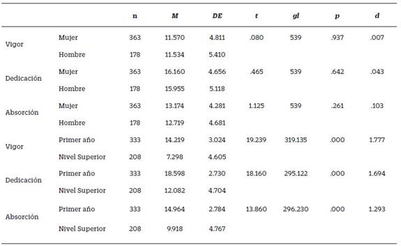 Se evaluó la invarianza factorial del UWES 9S según sexo y nivel de los estudiantes. Para ello, se amplió la muestra del estudio a 541 estudiantes. A la muestra de 333 estudiantes de primer año que se encontraban iniciando sus estudios universitarios, se incorporó una muestra de 208 estudiantes de niveles superiores. Esto con la finalidad de poder reconocer las posibles diferencias estructurales que podría tener el instrumento para evaluar a estudiantes que recién inician su proceso en la educación terciaria, con respecto de quienes poseen una experiencia universitaria mayor.