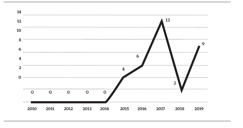 A continuación, la Figura 1 muestra la frecuencia de publicación de trabajos de grado de una escuela de posgrado peruana, según año de divulgación. De 307 trabajos de grado, se logró publicar 34 (11.07%). La mayor tasa de publicación se encuentra en el año 2017 (13), seguido por el 2019(9), y en menor frecuencia en los años 2016 (6); 2015 (4) y 2018 solo dos.