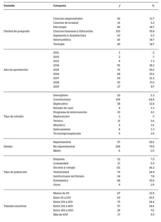 Method: : Descriptive study of document analysis in 307 theses approved in the period 2010 2019, from business sciences, health sciences, psychology, human sciences and education, engineering and architecture, public health and theology.