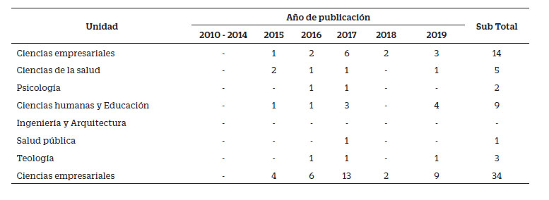 La Tabla 2 muestra los reportes de publicación científica de trabajos de grado, según unidad de posgrado y año de divulgación. Se observa que entre el periodo 2010-2014 no se difundió ningún resultado de trabajos de grado en alguna revista científica. En cambio, se observa que en el 2017 se logró la mayor frecuencia de publicación (13), luego en el 2019 (6) y en el 2016 (6); mientras que la frecuencia es menor en los años 2015 (4) y 2018 (2). Por último, la unidad con mayor cantidad de trabajos de grado publicados es la de Ciencias empresariales (14), seguida por Ciencias humanas y Educación (9), Ciencias de la salud (5), Teología (3), Psicología (2), Salud Pública (1) e Ingeniería y Arquitectura con ninguna.