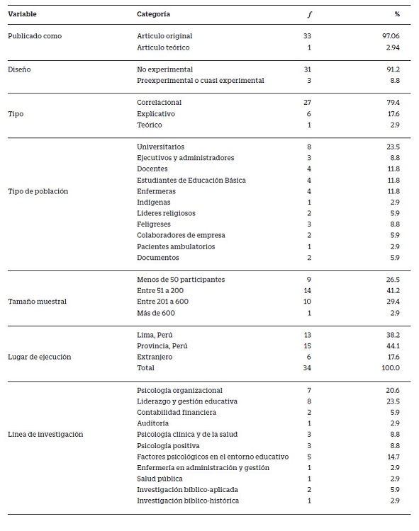 En ese sentido, en mayor proporción, los trabajos publicados obedecen a un diseño no experimental (91.2%), de tipo correlacional (79.4%), tomando como población a universitarios (23.5%), seguido de docentes (11.8%), estudiantes de educación básica regular (11.8%) y personal de salud como enfermeras (11.8%). El tamaño muestral más frecuente fue aquel que involucró entre 51 a 200 participantes (41.2%). Por otro lado, en cuanto al lugar de ejecución, en mayor proporción fueron realizados en provincias y departamentos del Perú (44.1%), en cambio en Lima capital un 38.2%, y en el extranjero 17.6%. Finalmente, la línea de investigación más frecuente corresponde a Liderazgo y Gestión Educativa (23.5%), seguido por Psicología Organizacional (20.6%) y Factores Psicológicos del Entorno Educativo (14.7%).