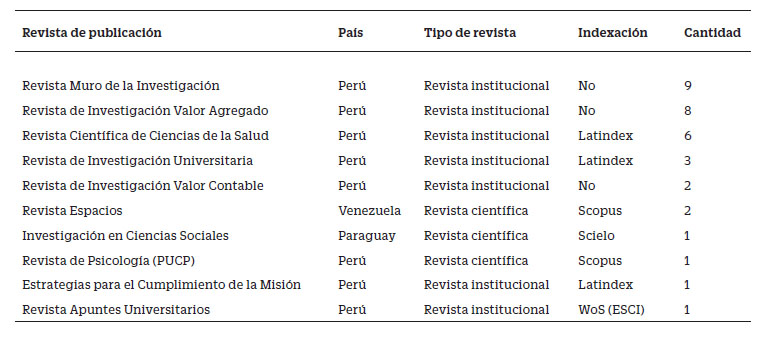 En la Tabla 4 se muestran las características de las revistas donde se publicaron los trabajos de grado de maestría. En este caso, siete son revistas institucionales y tres científicas; así, se observa mayor cantidad de publicaciones en la revista Muro de la investigación, Valor agregado y Revista científica de ciencias de la salud, todas del ámbito nacional (Revistas institucionales). En cambio, en revistas indexadas en Scopus y Scielo, como es el caso de Espacios (discontinuado en Scopus), Revista de investigación en ciencias sociales y la Revista de Psicología (Revistas científicas), solo hay cuatro publicaciones. Por último, hay tres revistas (Muro de la Investigación, Valor Agregado y Valor Contable) que aún no se encuentran indexadas.