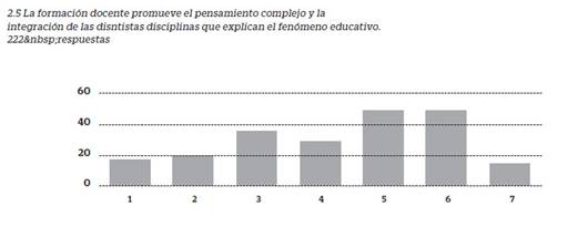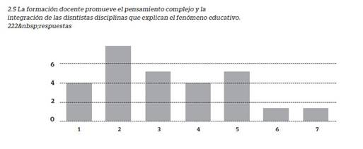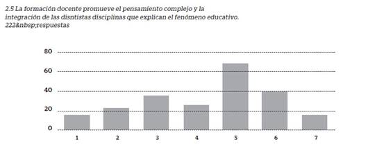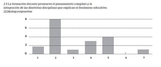 El ítem 2.5 evalúa la opinión sobre el pensamiento complejo. Aunque se muestran aparentemente dos ideas en un solo ítem, se redactó de manera en que el término pensamiento complejo fuese desglosado en términos más concretos como pensamiento que integra las diversas disciplinas que constituyen la formación en lugar de separarlas y aislarlas.
