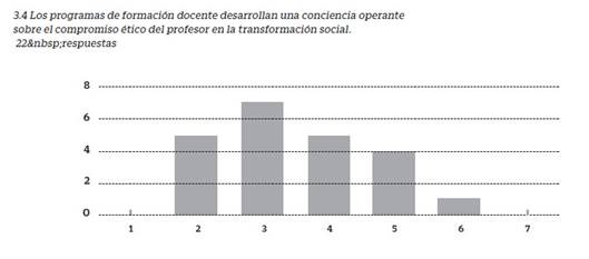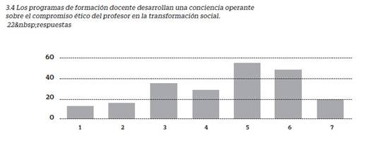 La pregunta que indagó la opinión de ambos grupos de participantes sobre la transformación social es la 3.4 del cuestionario, que está formulada así: Los programas de formación docente desarrollan una conciencia operante sobre el compromiso ético del profesor en la transformación social.
