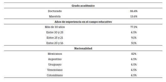 En el caso de los expertos, la encuesta se aplicó a una muestra de oportunidad de 22 académicos de reconocido prestigio en el campo de la formación del profesorado y de la política educativa. La muestra de expertos estuvo conformada por 13 hombres y nueve mujeres, de quienes se presentan algunos datos en la Tabla 1.