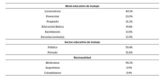 En el caso de la muestra de docentes, respondieron el instrumento un total de 222 profesores y profesoras, de los cuales 163 son mujeres y 59 hombres. En sus perfiles de formación predomina el grado de maestría con 110 docentes, seguido del de licenciatura con 57 y de doctorado con 55 participantes. A continuación, se presentan algunos datos de estos docentes en la Tabla 2.