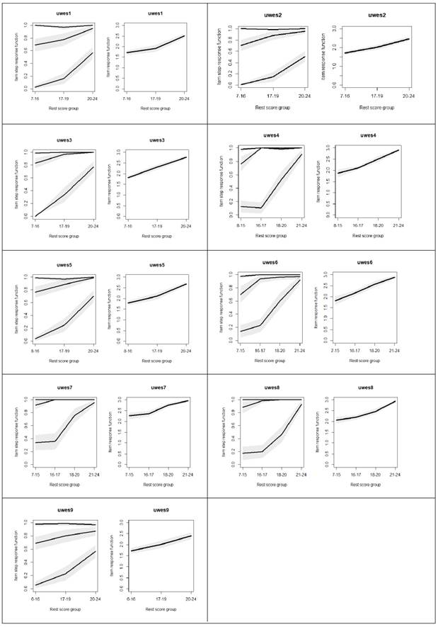 Se observa también que los ítems correspondientes al UWES-3 constantemente fueron los de mayor carga factorial comparados con el resto de los ítems, en los modelos de tres dimensiones y en el de una dimensión (Tabla 3). Los umbrales (la separación de las opciones en el continuo latente del puntaje del UWES-3) fueron irregulares en su separación, y el ítem 8 mostró que la última opción de respuesta no fue funcional debido a la ausencia de respuestas, y el umbral no fue estimado.