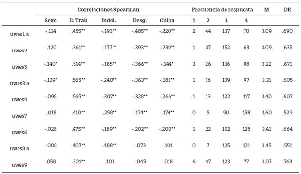 Información descriptiva de los ítems. La tendencia de respuesta del UWES (Tabla 1) se ubicó entre las opciones 3 ("regularmente: algunas veces al mes") y 4 ("frecuentemente: una vez por semana"), mientras que la primera opción ("esporádicamente: pocas veces al año o menos") fue predominantemente escasa y hubo una pobre frecuencia de respuesta; esto fue más claro en los ítems 7 y 8, donde no hubo respuestas en la primera opción. Las diferencias en el ranking promedio de cada ítem fueron estadísticamente significativas (Friedman - χ2 = 278, gl = 8, p < .001), con tamaño de efecto Kendall - W = .523 (IC 95% = .514, .262). Respecto a las correlaciones inter-ítem (no mostrada en la Tabla 1), la identidad correlacional no fue mantenida, χ2 = 2601.53, gl = 36 (p < .01), indicando que existen diferencias en la magnitud entre las correlaciones inter-ítem.