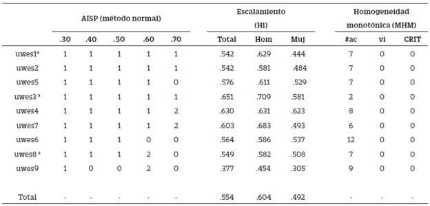 Identificación de escalas. En primer lugar, el procedimiento AISP arrojó con más claridad que se puede obtener una sola escala en el rango de H entre .30 a .50 (Tabla 2, lado izquierdo). En el nivel más alto (H > .50) no se identificó una configuración de tres escalas, lo que converge con el análisis paramétrico del párrafo anterior, en que los ítems convergen en una sola dimensión del UWES-9.