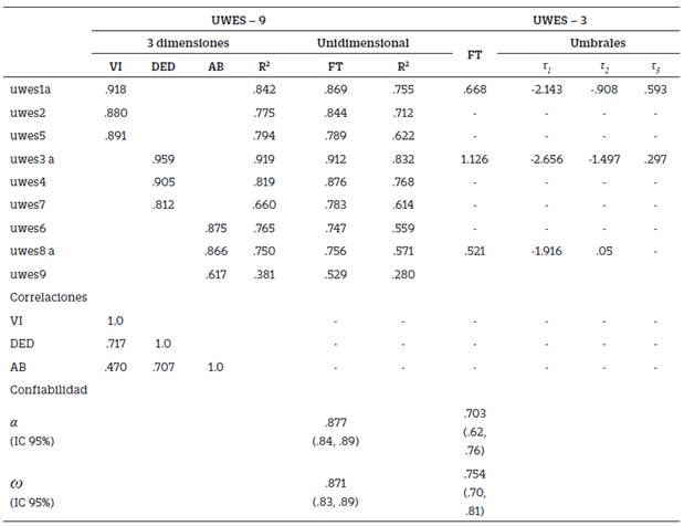 En la versión UWES-9 (Tabla 3), el modelo de tres factores correlacionados se ajustó satisfactoriamente: WLSMV-χ2 = 122.636, gl = 2 (p < .01); CFI = .989, TLI = .984, SRMR = .076; sin embargo, las correlaciones interfactoriales fueron elevadas, sugiriendo falta de discriminación conceptual entre ellas. El modelo unidimensional también fue satisfactorio, WLSMV-χ2 = 316.665, gl = 27 (p < .01); CFI = .968, TLI = .958, SRMR = .122, aunque ligeramente bajo. El ajuste del UWES-3 fue completamente satisfactorio: WLSMV-χ2 = 638.132, gl = 3 (p < .01); CFI = 1.000, TLI = 1.000, SRMR = .000. Las cargas factoriales en todos los modelos fueron elevados (> .50) y estadísticamente significativos. El ítem 3 en el modelo del UWES-3 mostró carga superior a 1.0, pero no fue necesariamente un caso Heywood debido a su magnitud. No se detectaron modificaciones al modelo unidimensional del UWES-9, y no fueron explorados.