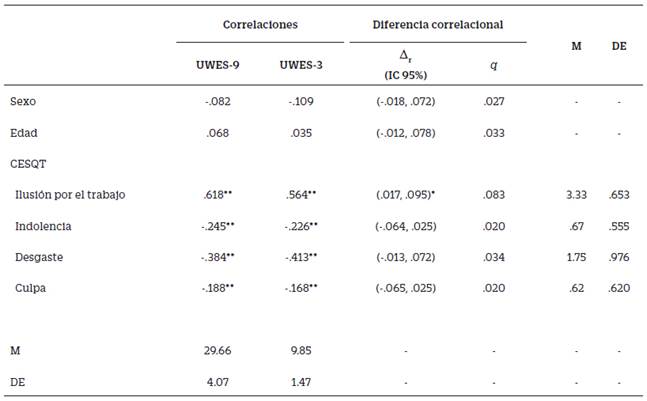 La correlación no ajustada (r = .931, p < .01) y ajustada (r = .824, p < .01) entre UWES-9 y UWES-3 fue elevada, indicando muy similar ordenamiento de sujetos desde ambos puntajes. El acuerdo clasificatorio fue moderadamente alto, AC1 = .611 (IC 95% = .537, .687), indicando la tendencia a diferenciar sujetos cuando son clasificados en cuartiles. Respecto a equivalencia de la validez o discriminación de constructo con el síndrome de quemarse por el trabajo, las correlaciones del UWES-9 (puntaje único basado en el modelo unidimensional; ver párrafos arriba) y UWES-3 obtenidas mostraron coherencia teórica (Tabla 4). La correlación con la dimensión de Ilusión por el Trabajo del CESQT-PE fue positiva y alta, mientras que con el resto de los puntajes fue de dirección negativa y bajas o moderadamente bajas, como se esperaba. Respecto la diferencia correlacional, ambas versiones produjeron magnitudes correlacionales similares; la magnitud de estas diferencias estimadas fue pequeña, porque: a) entre 8% y 11% más bajo respecto a la versión UWES-9, b) los intervalos de confianza para las diferencias correlacionales (∆r) incluyeron el cero (excepto en Ilusión por el trabajo), y c) la diferencia estandarizada (q) fue entre .020 y .083, es decir, de magnitud insustancial. Considerando la edad y el sexo de los participantes, los puntajes de ambas versiones correlacionaron cero en la población, y la diferencia correlacional fue insustancial (q alrededor de cero) (Tabla 4).