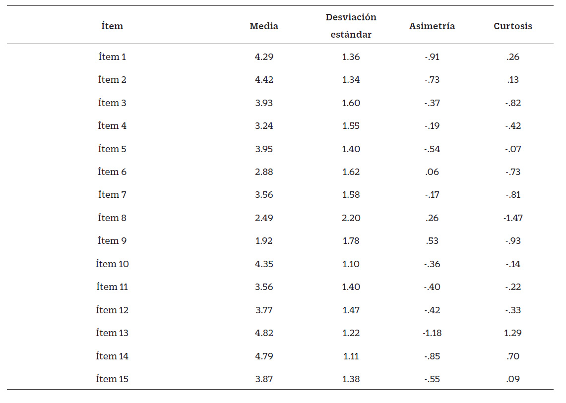 En primer lugar, se analizaron los ítems del MBI-SS a través de estadísticos descriptivos: media, desviación estándar, asimetría y curtosis. Se verificó su normalidad considerando valores de asimetría y curtosis entre -1 y 1 (Darlington y Hayes, 2017). La normalidad multivariante se corroboró mediante el coeficiente de Mardia (Esnaola et al., 2011).