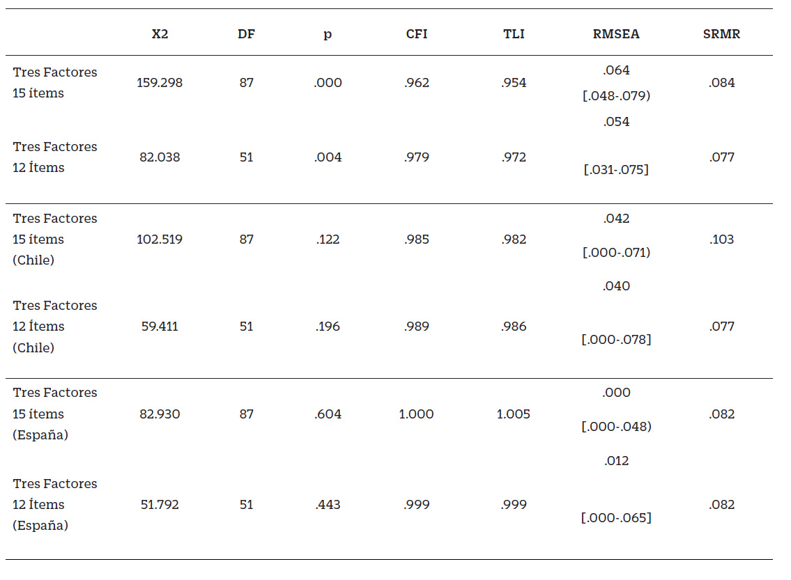 Método: Se efectuó un estudio instrumental en una muestra no probabilística por cuotas en 103 estudiantes universitarios chilenos y 104 estudiantes españoles. Se realizó un análisis factorial confirmatorio, se analizó la confiabilidad del instrumento y su invarianza factorial para la muestra española y chilena. Los resultados confirman su estructura factorial de tres factores y muestran que el instrumento presenta una adecuada confiabilidad y una invarianza factorial en su versión propuesta de 12 ítems.