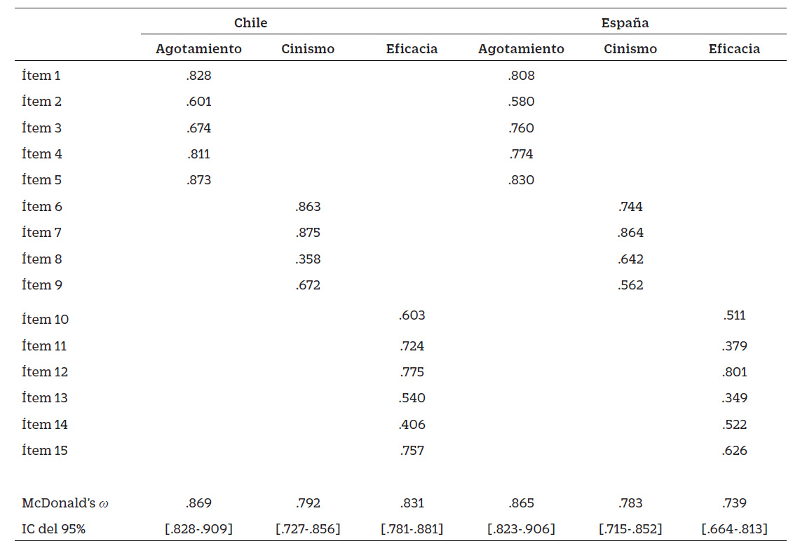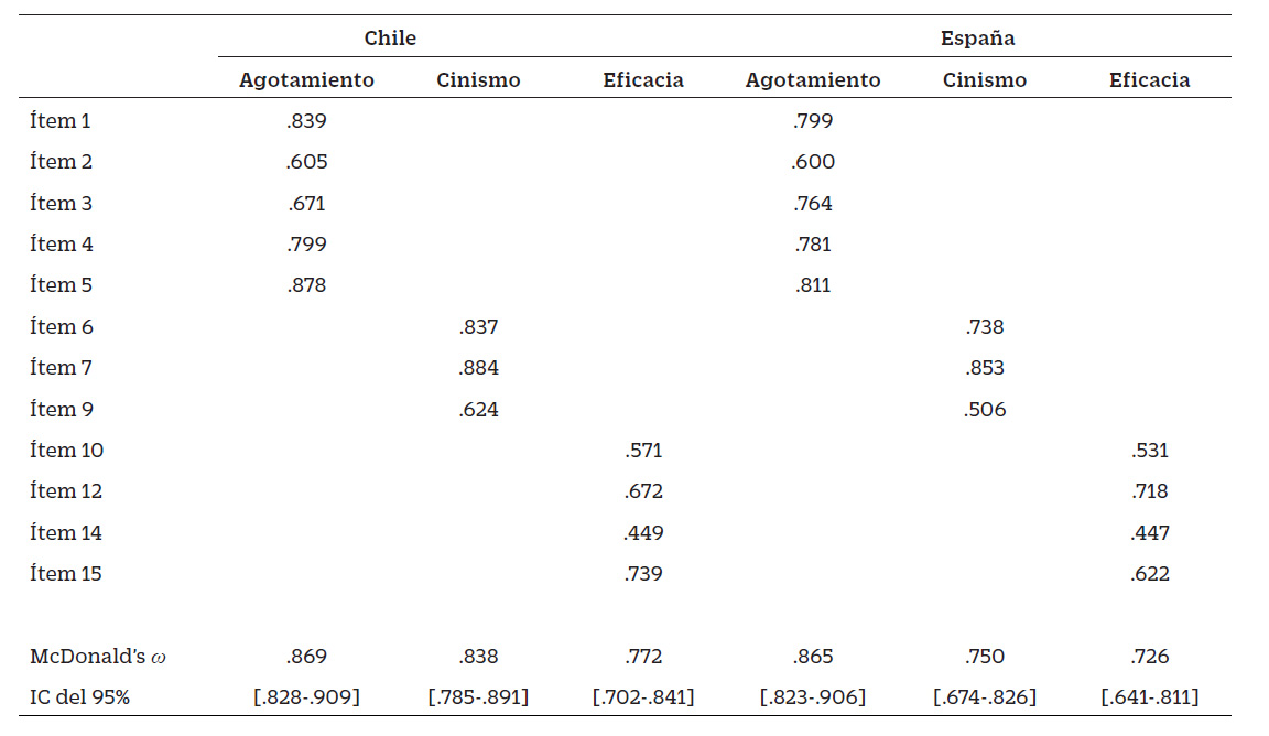 Los indicadores de confiabilidad omega son de ,814 en agotamiento, ,741 en cinismo y .776 en eficacia en la primera submuestra y de .802 en agotamiento, .711 en cinismo y .818 en eficacia en la segunda submuestra. En España ( ), en una muestra de 1,209 estudiantes de la comunidad autónoma de Andalucía mediante una factorial exploratorio y confirmatorio, los autores encontraron que una versión de 12 ítems del instrumento presentaba los mejores niveles de ajuste, de acuerdo con un modelo de tres factores ( 2/dl = 3.155, CFI = .966, TLI = .953, GFI = .961, RMR= .167, RMSEA= .061). En relación con la confiabilidad sus resultados muestran para el factor agotamiento emocional = .83, para el factor cinismo = .82 y para el factor eficacia académica = .79. Un reciente estudio con estudiantes universitarios españoles ( ) concluye que la estructura interna del MBI-SS queda bien reflejada por el modelo oblicuo congenérico de tres factores, alcanzando buenos valores de fiabilidad y validez convergente y discriminante.