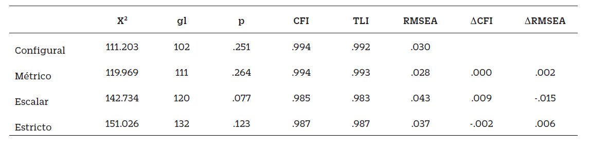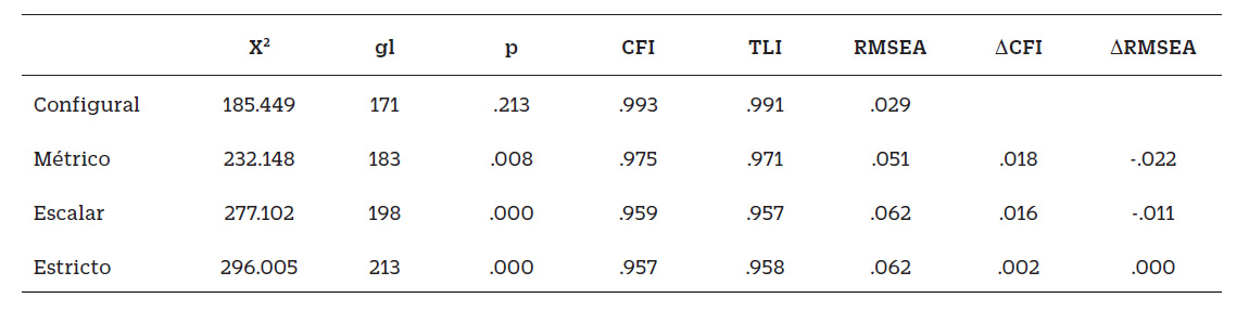 Los índices que se consideraron en el análisis factorial confirmatorio, como en la estimación de la invarianza factorial fueron: Chi2/gl, el índice de Tucker-Levis (TLI), el índice de bondad de ajuste comparativo (CFI). Se tomaron en cuenta las recomendaciones de Hu y Bentler (1999), quienes recomiendan valores superiores a 0,95 en CFI y TLI para considerar un ajuste adecuado. Así mismo, valores inferiores a 0,06 en RMSEA se estima como adecuado. Al comparar los modelos, se estima como mejor aquel que posee valores más altos en CFI y TLI y valores más bajos en RMSEA en comparación a los otros.