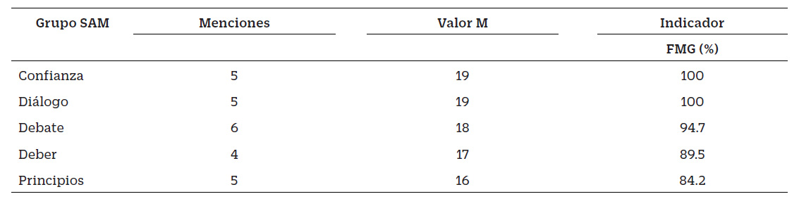 También se observa que en el Grupo SAM los campos semánticos mayormente concurrentes -FMG- fueron la “confianza” y el “diálogo”, ambos con un peso de 19, y fueron enunciados por el 26.3% de los participantes; en tanto que los cinco términos más relevantes constituyeron el 15.1% de todas las menciones hechas por las estudiantes. En lo correspondiente a la correlación entre el número de las menciones y el valor M -que representa- el peso semántico se encontró que los enunciados en su mayoría se ordenan de manera muy similar, lo cual se comprobó mediante un valor de correlación de Spearman de 0.864 con valor de p < 0.01.