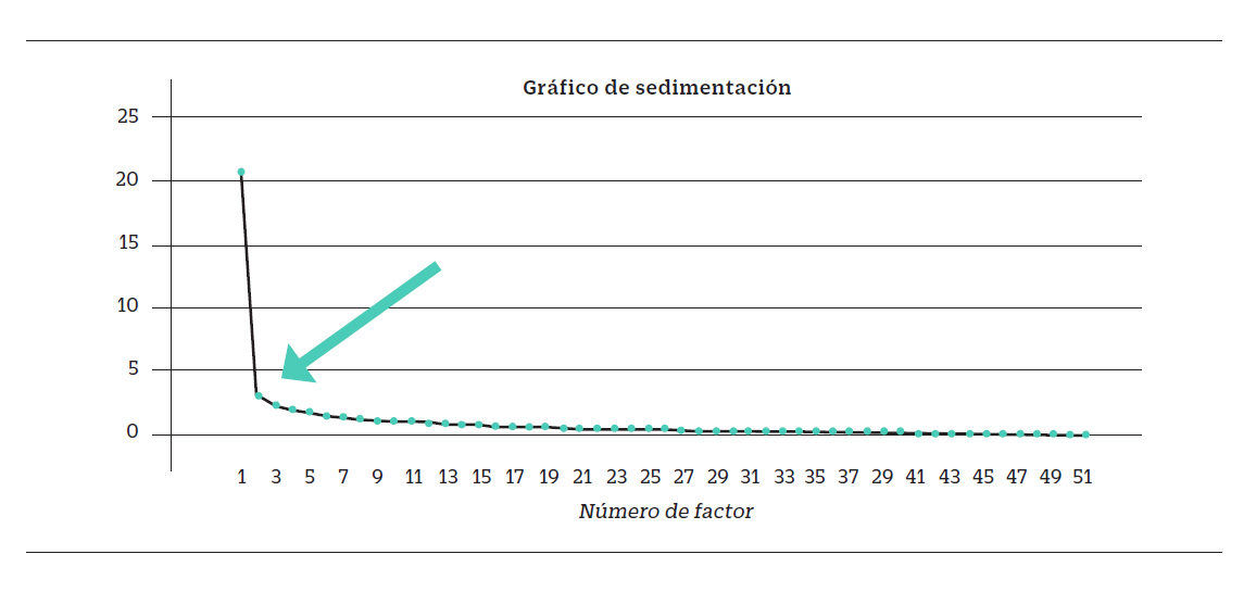 Para el AFE se realizó siguiendo cuatro fases: la primera fue determinar la matriz de correlación mediante la prueba de esfericidad de Barlett, que indica que los datos de todas las variables (preguntas) se correlacionan entre sí, y la media de la adecuación de la muestra Kaiser-Meyer-Olkin (KMO) (Aguilar 2003). Kaiser y Rice (1974) ( do en Ferrando, 2022) propusieron el índice KMO que establece que, a mayor valor del índice, más comunalidad disponible en la matriz de correlación. Se han sugerido toda una serie de valores para cualificar la cantidad de la comunalidad disponible; solo matrices con valores de KMO superiores a .75 merecen ser estudiadas mediante Análisis Factorial. La fase dos fue la estimación de factores la cual se realizó mediante un Análisis Factorial Exploratorio (AFE) utilizando el método de factorización de eje principal. La siguiente fase fue la extracción de factores, empleando para ello el Análisis Paralelo (AP) ( ), además, se consideró el “criterio de contraste de caída “(Hair, 1999) o “gráfico de sedimentación (López. 2015), tomando el número de factores a extraer determinado por el cambio en la continuidad en la curva. La siguiente etapa fue la rotación de factores, empleando una rotación oblicua, mediante el método Promax, empleando como valor de saturación de los ítems de 0.35, lo que representa la correlación entre la variable original y su factor (Spector, 1992).