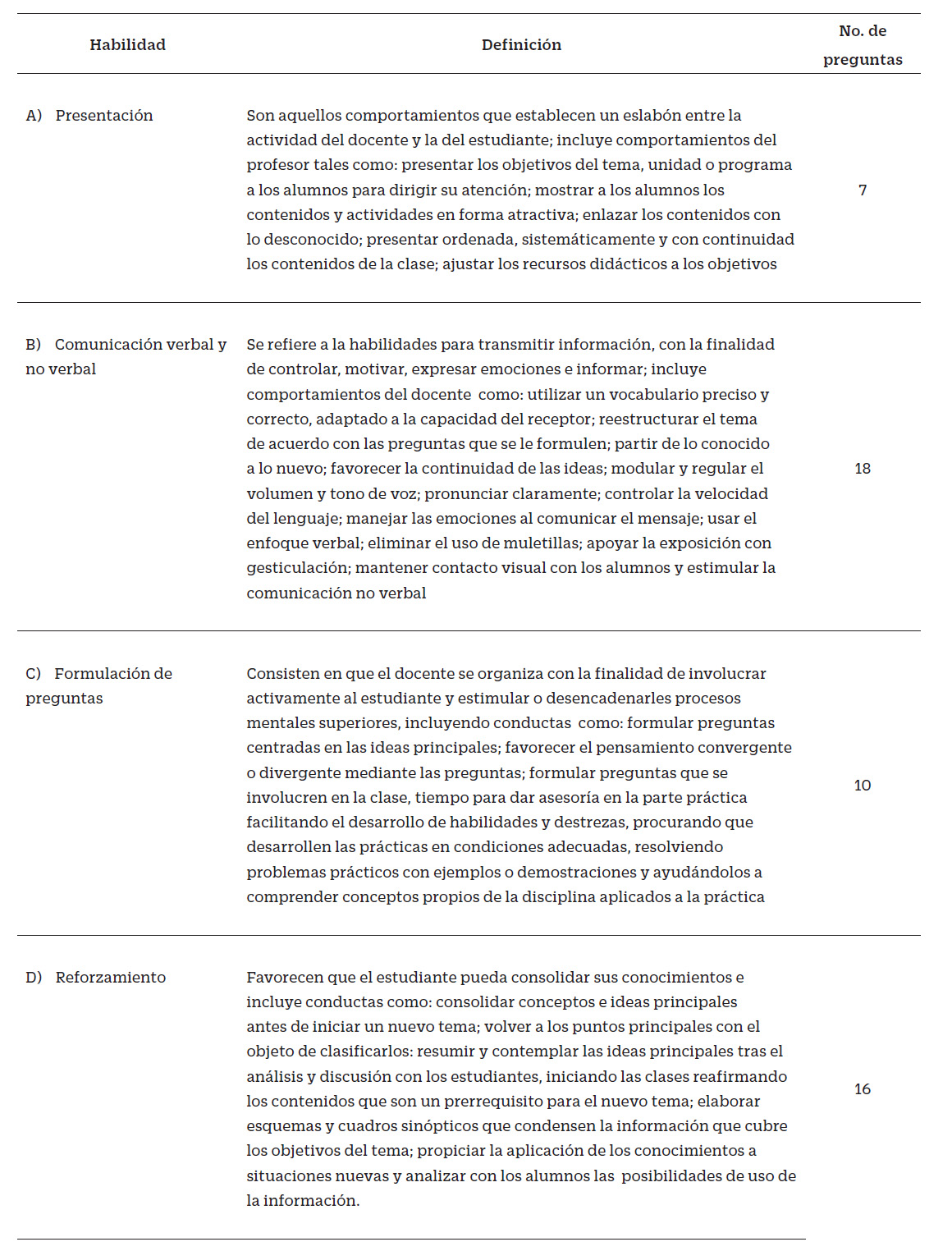 Al respecto, Dwight (1967), elaboró un cuestionario de 35 preguntas para los estudiantes universitarios (docentes de recién ingreso) dividido en 7 habilidades de enseñanza (reforzamiento, variación de estímulos, inducción, lectura y uso de medios audiovisuales, habilidad de explicación y uso de ejemplos y preguntas iniciadas por los alumnos), en donde cada pregunta tiene siete niveles de acuerdo con una escala de Likert. No se establece una validez y confiabilidad, solo se menciona que se obtuvieron resultados estadísticamente significativos (p= 0.001). Guillermo (1997), diseñó un instrumento de 24 preguntas aplicado a docentes de la licenciatura en docencia, dividido en tres habilidades didácticas (reforzamiento, formulación de preguntas e integración), considerando 5 niveles de calificación de acuerdo con la escala de Likert, sin mencionar confiabilidad ni validez del instrumento empleado.