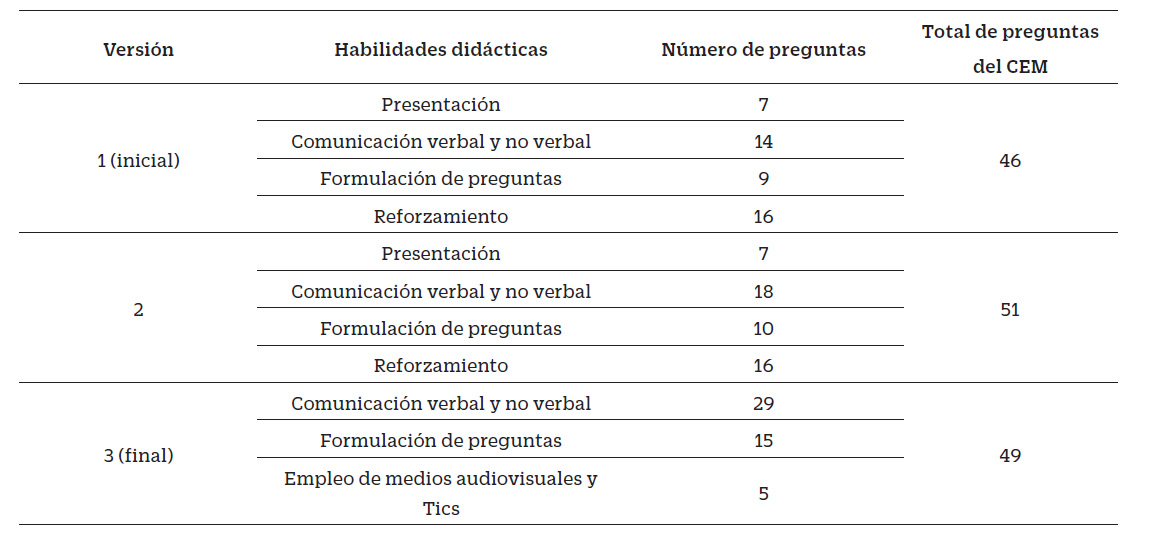 Para la validación de contenido, las observaciones realizadas a la versión 1 del CEM por parte de los docentes expertos, 7 de las preguntas permanecieron sin cambio (15.2%), 38 preguntas (82.6%) presentaron cambios en su redacción principalmente en la conjugación de verbos, en algunas de estas preguntas se cambió la redacción para hacerlas más entendibles y sólo una pregunta (2.1.%) fue eliminada. Así mismo, fueron adicionadas 6 preguntas nuevas: 4 en la habilidad de comunicación verbal y no verbal y 2 en la habilidad de formulación de preguntas. Se cambiaron los niveles de calificación de las preguntas por: 0=muy deficiente, 1= deficiente, 2= regular, 3=bueno y 4=muy bueno. Con base en lo anterior, se conformó la versión 2 del CEM con 51 preguntas, con 4 habilidades didácticas, como se observa en la tabla 2.