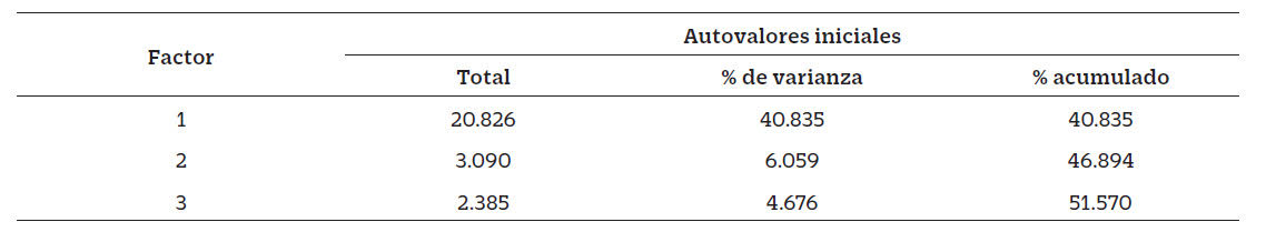 Para la extracción de factores se empleó el Análisis Paralelo (macro de SPSS, ( )) y el gráfico de sedimentación (fig. 1), dando como resultados la distribución de las preguntas en tres factores. En la tabla se muestra que la varianza acumulada para los tres factores fue del 51.57% (Tabla 3)