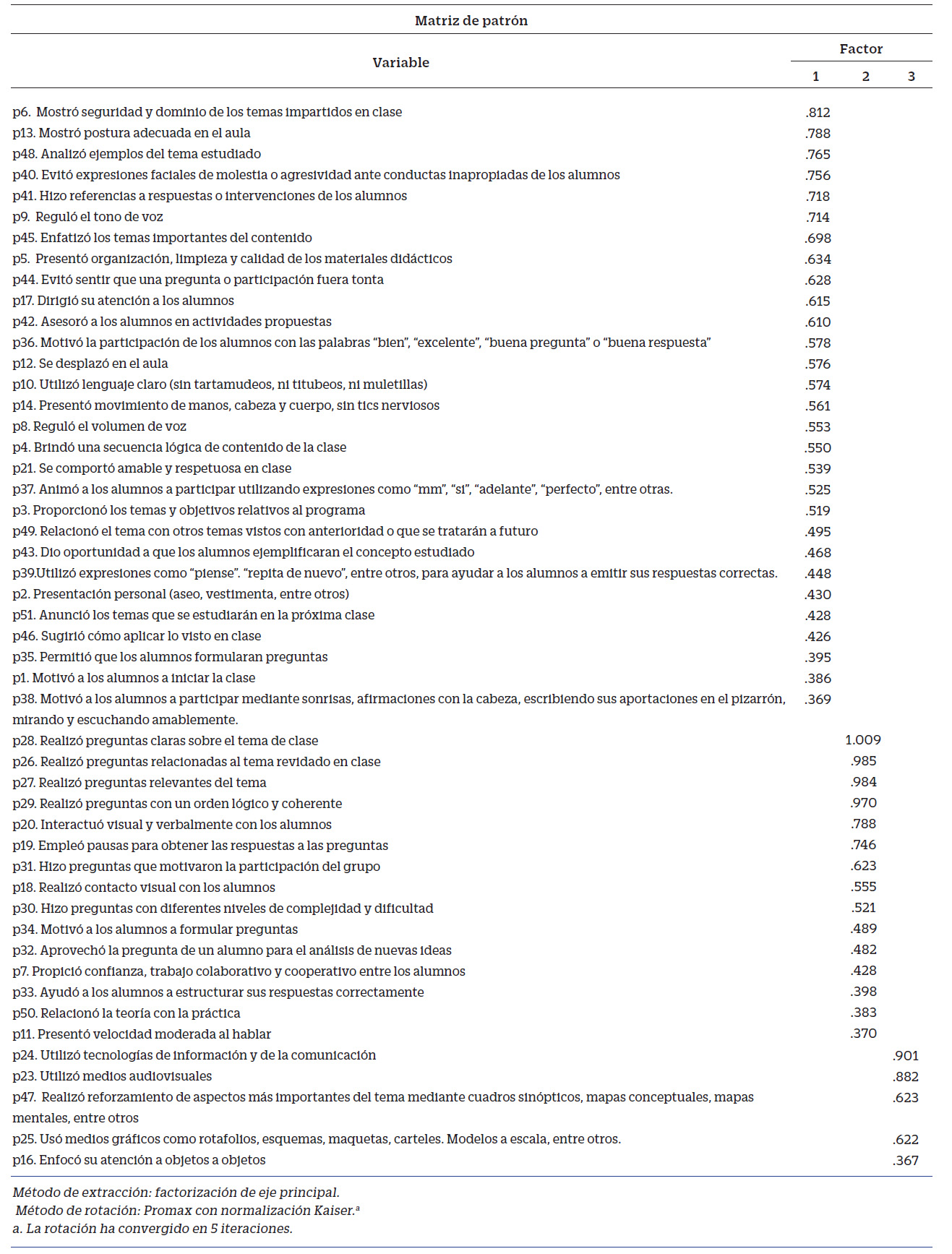 En la tabla 4 se muestra el resultado de la rotación oblicua de la matriz patrón de tres factores para determinar el número de variables (preguntas) para cada factor. Las preguntas “Utilizó gestos para conducir al grupo /gesticulación del rostro)” y “utilizó pizarrón” fueron eliminadas debidos a que tuvieron cargas factoriales menores 0.35.