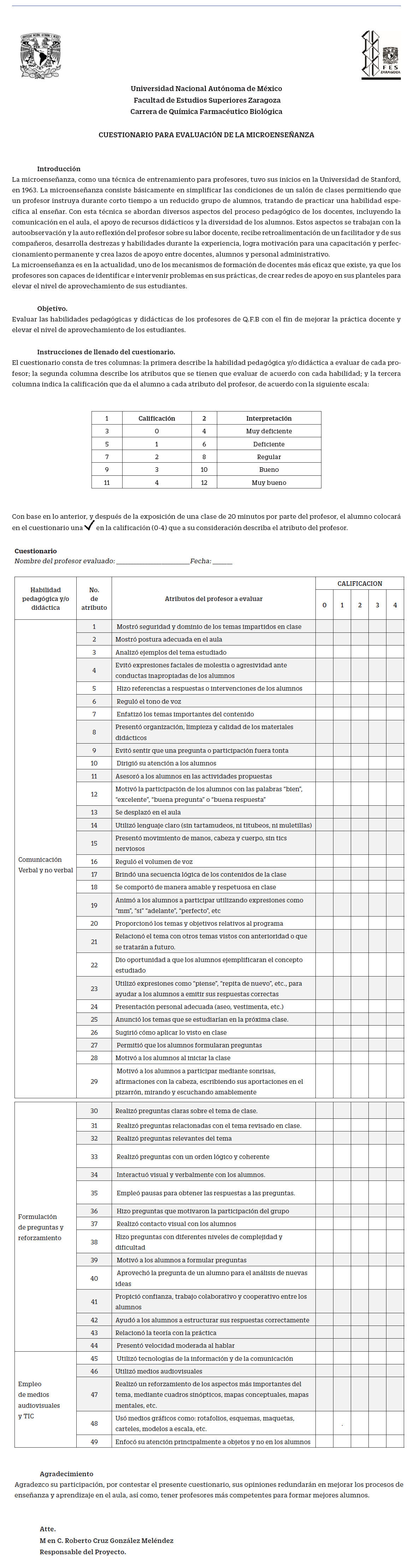 Por otro lado, la Carrera de Química Farmacéutico Biológica (Q.F.B.) de la Facultad de Estudios Superiores (FES) Zaragoza de la Universidad Nacional Autónoma de México (UNAM) ha realizado por varios años procesos de evaluación de la docencia, y ha implementado diferentes estrategias con la finalidad de fortalecer estas evaluaciones, como proponer cursos de actualización docente, cursos de formación pedagógica, estímulos académicos, entre otras acciones para mejorar el desempeño académico de los docentes en el aula de clases. Dentro de estas estrategias se ha propuesto la implementación de la técnica de la microenseñanza como una alternativa práctica que permita mejorar las habilidades didácticas y pedagógicas de los docentes de la carrera. Para conocer si se consigue lo anterior es necesario contar con un instrumento válido y confiable que permita evaluar las mejoras en las habilidades didácticas que presentan los profesores al aplicar la técnica de la microenseñanza, mediante la opinión de los estudiantes.