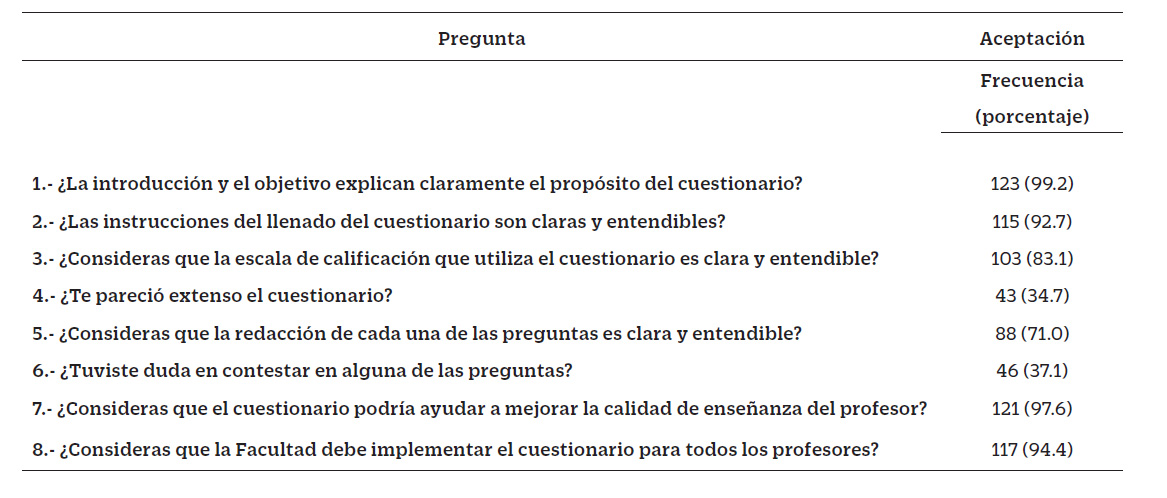 Para la validez de contenido con las aportaciones proporcionadas por los expertos se realizaron mejoras importantes para dar lugar a un cuestionario con una estructura, pertinente, bien definida, con una secuencia lógica, redacción clara y congruente con el objetivo del instrumento, con niveles de calificación adecuados para cada pregunta, logrando que fuera entendible para ambos actores del proceso de enseñanza-aprendizaje. La validez del constructo fue a partir de la opinión de los alumnos. Este estudio es coincidente con el de , ya que la aplicación del instrumento fue a estudiantes propiamente a diferencia de los demás reportes que aplicaron sus instrumentos a docentes nuevos o en formación.