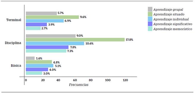 En la Figura 1 se pueden observar de manera más clara las diferencias significativas de la opinión de los estudiantes respecto a los objetivos de enseñanza según su etapa formativa: a nivel general, en aquellos participantes que se encuentran cursando los primeros semestres de sus programas de estudio predominó el aprendizaje individual, mientras que en los alumnos que se encuentran en la etapa formativa intermedia (disciplinar) y final (terminal), predominó el aprendizaje situado como principal objetivo de enseñanza fomentado por sus docentes.